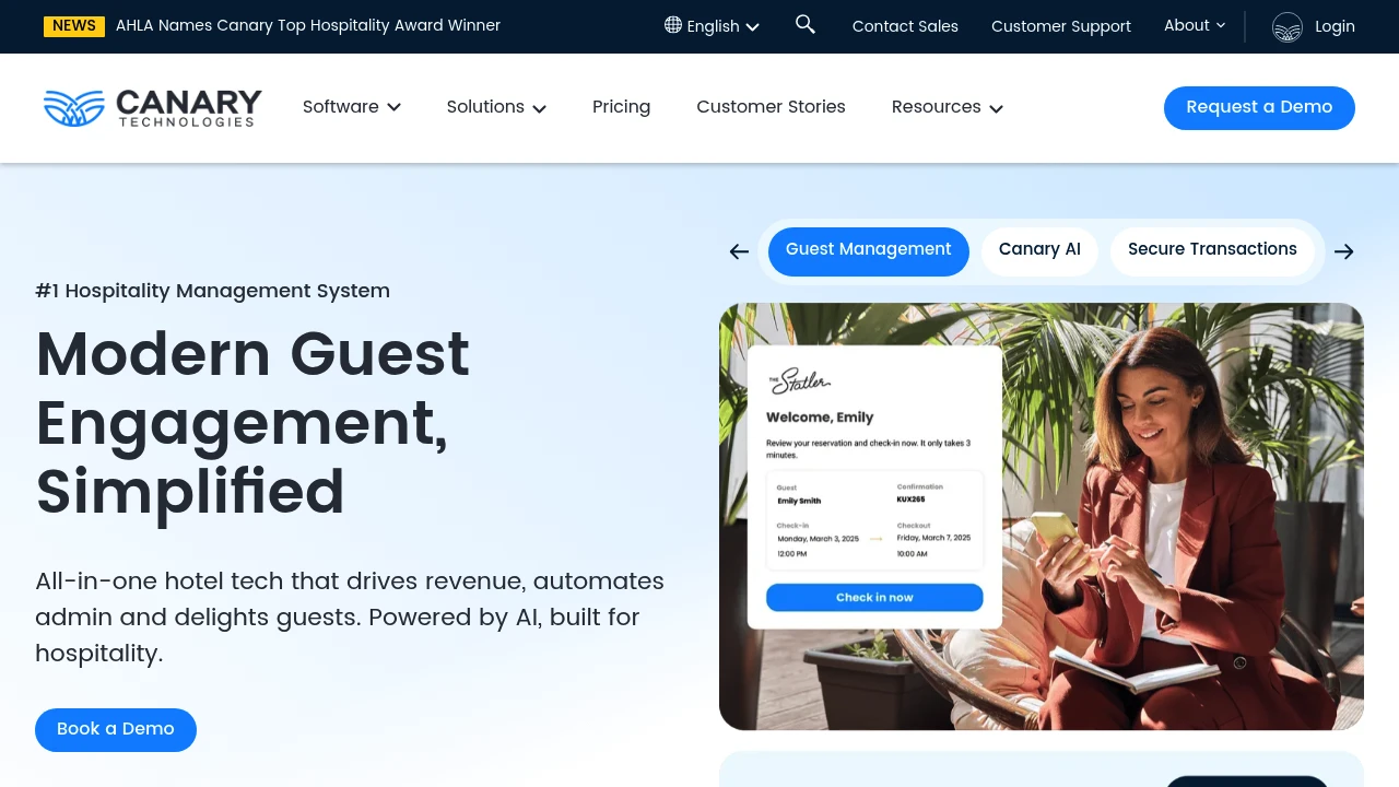 Powered by Canary AI, the system centralizes guest communication and personalizes interactions, freeing up your staff to focus on delivering exceptional in-person hospitality. It seamlessly integrates with all major hotel property management systems (PMS), CRMs, and payment providers.